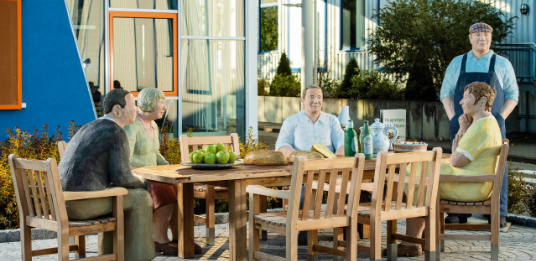 Zahlreiche Skulpturen der Künstlerin Christel Lechner zieren unser Firmengelände in Wittenburg, darunter eine gemütliche Tafelrunde, die Menschen nach Feierabend zeigt. Besucherinnen und Besucher setzen sich häufig auf die noch freien Stühle am Tisch. Vielleicht nehmen Sie auch bald Platz und machen ein Selfie?